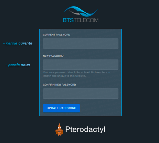 (în caz că ți-ai uitat parola, ți-o poți schimba din panelul btstelecom.ro sau te deloghezi de pe pterodactyl dashboard și dai reset password.)